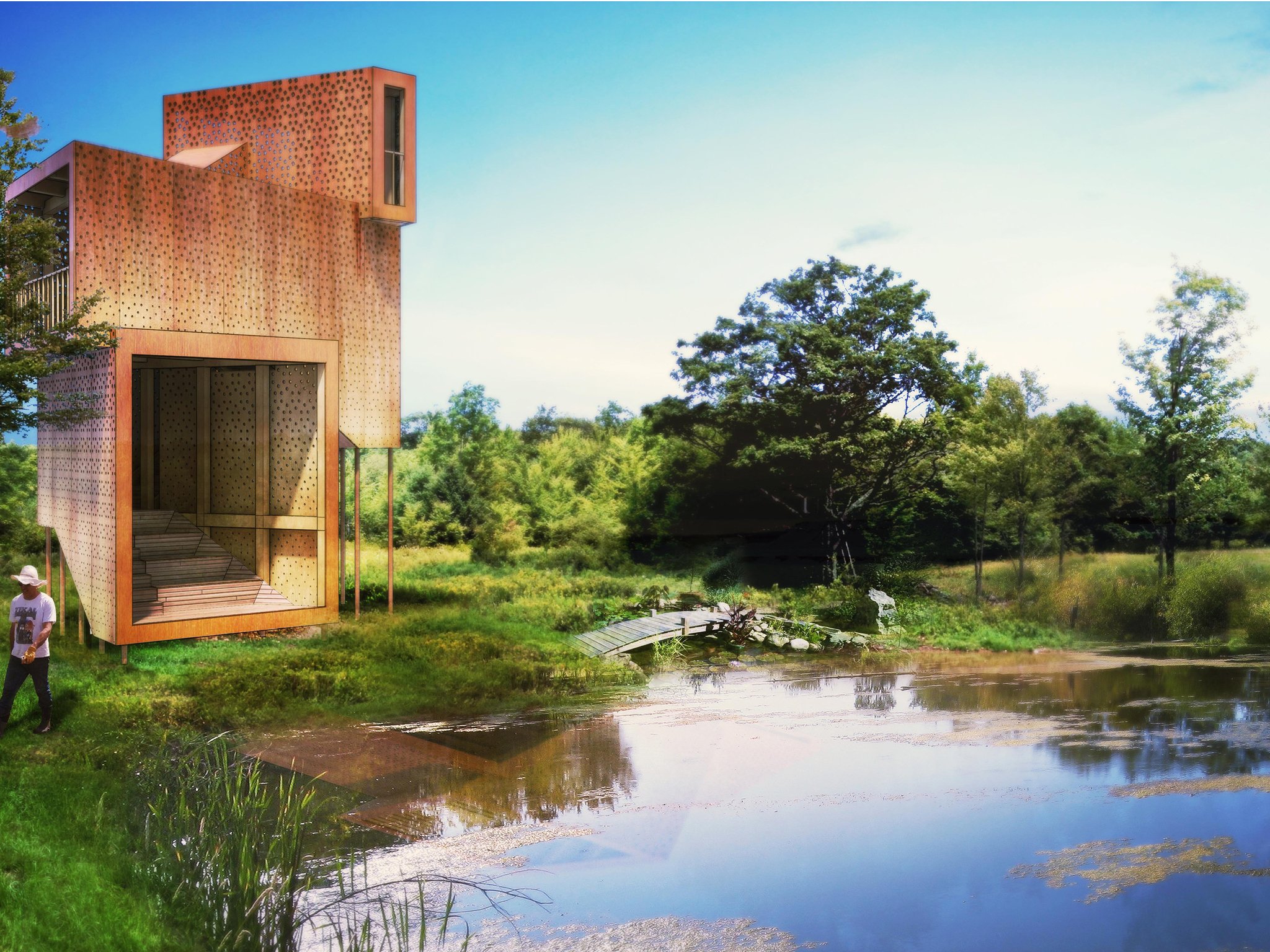 2012A multistory lookout pavilion orchestrated to the different cardinal views of a unique site in the Catskills. Starting with a pond-side lookout on the ground floor, the pavilion corkscrews between a series of different viewing windows, ending in an upperfloor lookout over an old stone wall and into a wetlands environment. The structure is conceived as a modern take on traditional heavy timber framing, with a digitally perforated cladding that deteriorates as the canopy ascends vertically.
